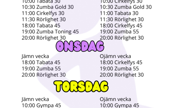Jämn vecka Måndag 10:00 Tabata 30 10:30 Zumba Gold 30 11:00 Cirkelfys 30 11:30 Rörlighet 30 18:00 Tabata 45 19:00 Zumba Toning 45 20:00 Rörlighet 30 Onsdag 18:00 Tabata 45 19:00 Zumba 55 20:00 Rörlighet […]